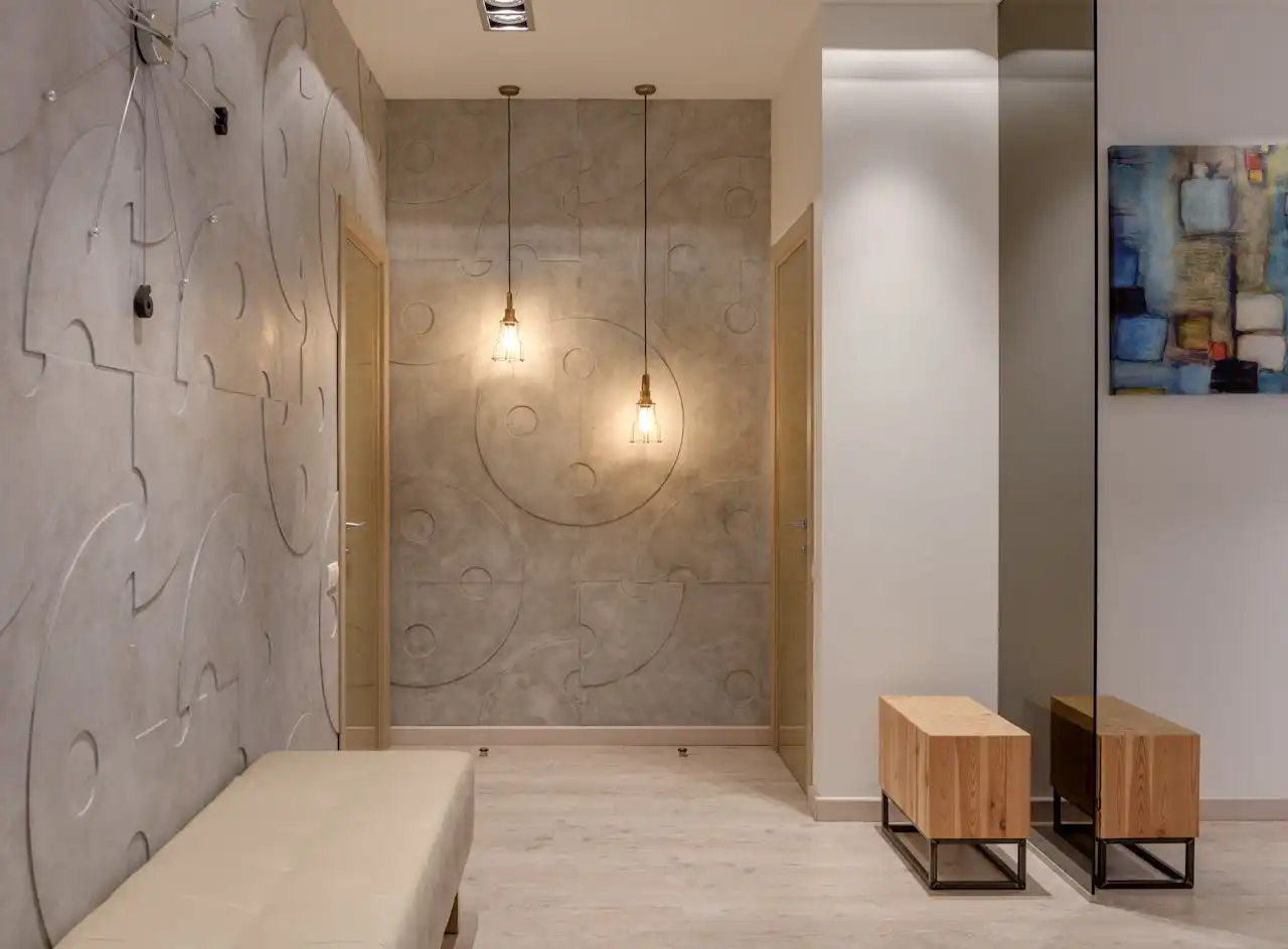 Mirror tiles create dramatic accent walls that reflect light and make spaces appear larger. These work particularly well in bathrooms, dining rooms, and small living spaces.